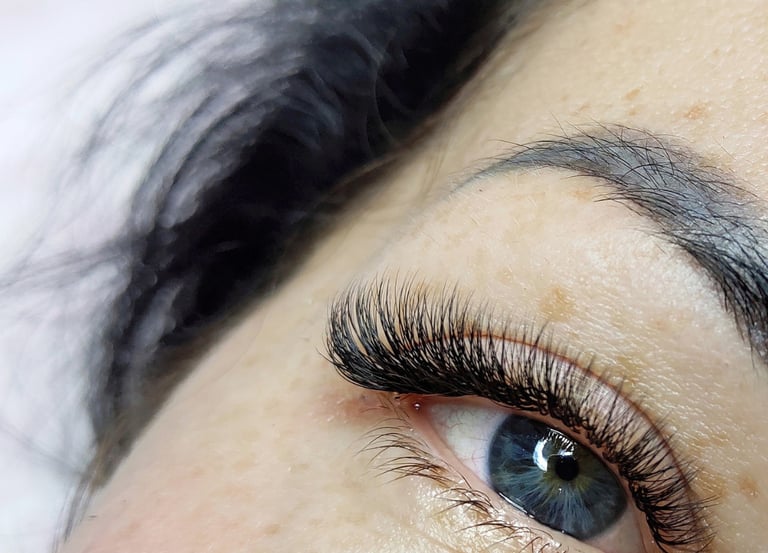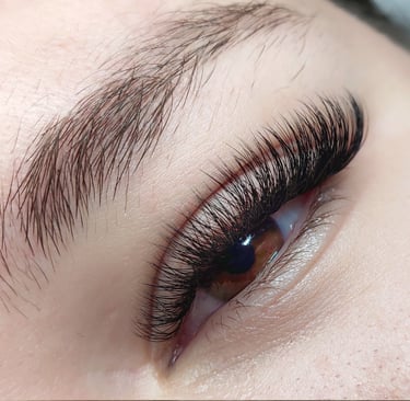 The Wispy Hybrid Set creates a feathery, fluttery effect by combining light, textured lashes with carefully placed volume extensions. This look is perfect for those wanting a more striking yet soft appearance.